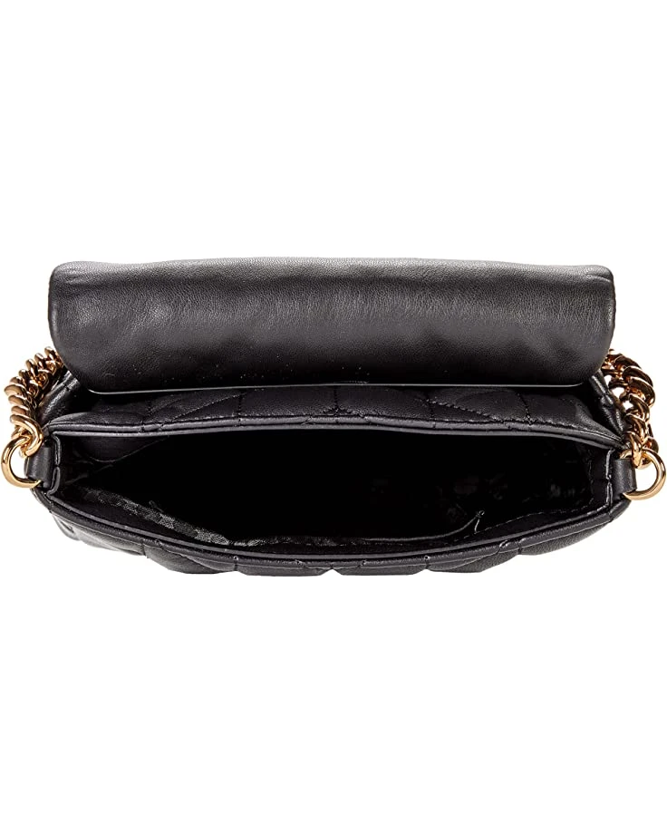 - Features a fold-over magnetic snap closure, quilted leather design, and brand logo and wordmark pinmounted on front.