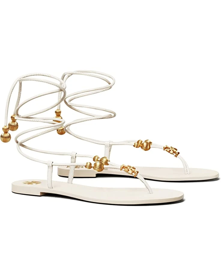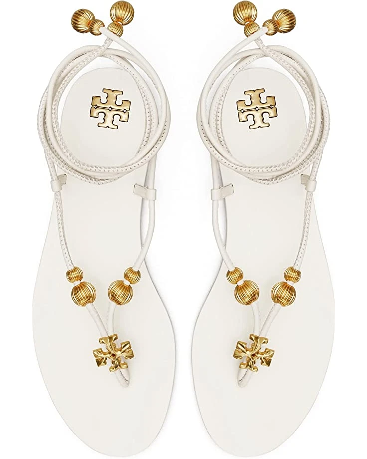 - Elegance, style, and sophistication comes together with the Tory Burch Capri Flat Lace-Up Sandal with its gorgeous gold colored carved Double T and fluted beads decorating the sandal, as well as a comfortable leather sole, and straps that wrap around your ankle for both style and fashion.